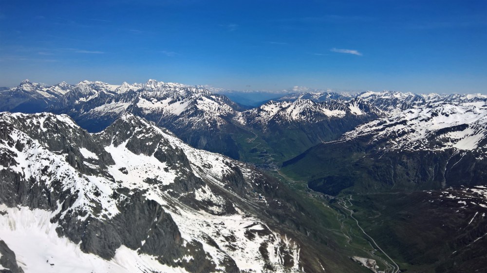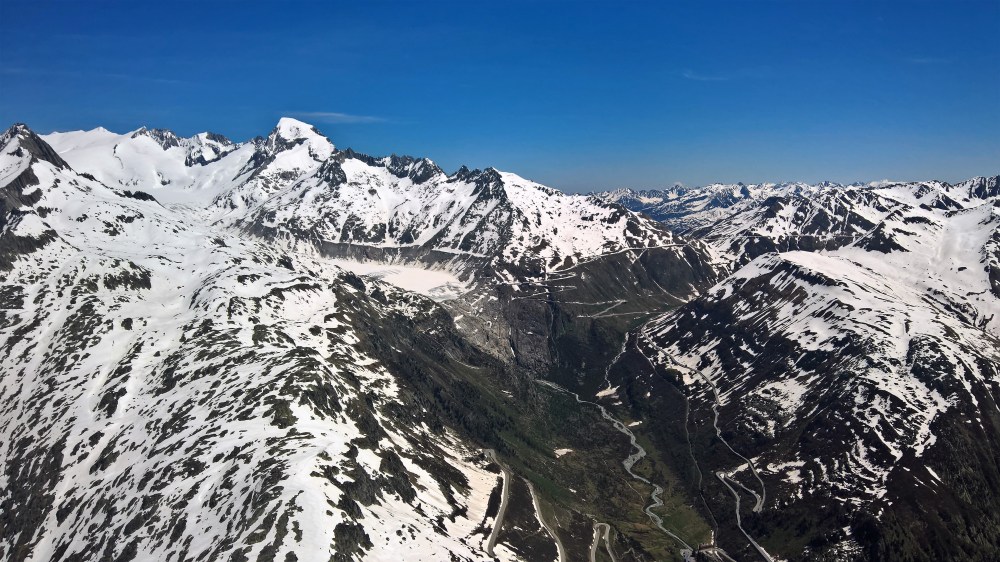 Die Hochalpen noch im Schnee ging’s bei herrlichen Bedingungen, Rückenwind und hoher Gleitzahl an Furka / Realp vorbei, via Andermatt über den Oberalppass in die Surselva.